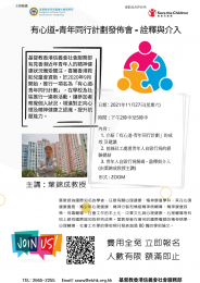 有见近年青年人的精神健康状况备受关注,本机构于2020年9月开始获香港救助儿童会资助推行「有心道─青年同行计划」,于学校及社区举办多项活动,增进青年人对正向心理及精神健康的认识,并提升他们的抗压能力。机构将于2021年11月27日举行有心道 ─ 青年同行计划发佈会 ─ 诠释与介入,向青年工作者分享计划经验,欢迎报名参加。