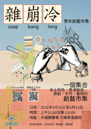 「杂崩冷」青年创艺市集是一个售卖全本地自家制作产品的「社区墟市」。年青人不但可以在此汲取创业经验,更可以展示创作技能和提升能力感,而墟市则有促进社区经济发展的作用。诚邀大家参与4月10及11日于大埔宝乡桥六乡学习园地举行的「杂崩冷」青年创艺市集,支持年青人创作!支持社区经济发展!