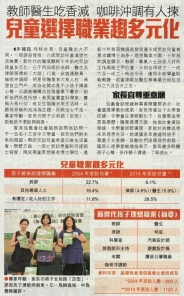 學童以個人興趣選職業 三成想從事表演行業 - am730 6成受訪童 盼未來無憂安定 - Hong Kong Economic Times 香港學童愛仿韓星 - Metro Daily 學童擇業心聲想做老闆明星 - Oriental Daily News 六成兒童冀將來生活無憂 - Sing Tao Daily 6成兒童盼未來安定 - Sky Post 兒童選擇職業趨多元化 - The Sun 理想職業多元化 港童今勝昔 - Wen Wei Po 兩成半孩子渴望富貴 團體促設兒童事務委員會 - Hong Kong Daily News 六成受訪學童盼過無憂生活職業期望則趨多元 - RTHK Children’s dream jobs now more diverse: poll - South China Morning Post 六成受訪童盼生活無憂 - 大公報