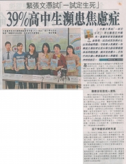 TVB新聞 - 高中生瀕患焦慮症 ATV 國際台新聞 - 港近四成高中生出現焦慮 近四成高中生情緒焦慮指壓力來自文憑試 - 商台 調查發現近四成高中生有焦慮情緒問題 39%高中生瀕患焦慮症 緊張文憑試「一試定生死」 - 星島 文憑試即將放榜 老師家長寄厚望 近四成高中生有焦慮情緒 - 成報 近四成高中生潛在焦慮情緒 - 東方日報 四成高中生潛在焦慮情緒 - 太陽報 本港近四成高中生有焦慮 較外國高兩成 - Oncc 四成高中生情緒焦慮 - 新報 港近四成高中生出現焦慮 - 香港商報 四成高中生焦慮 愈近放榜愈緊張 - 文匯報 四成高中生有焦慮症狀 - 大公報 考試壓力下四成高中生焦慮 - 明報 調查指四成高中生感焦慮 - 頭條網 壓力爆煲 近四成高中生瀕患焦慮症 - 巴士的報(星島集團)